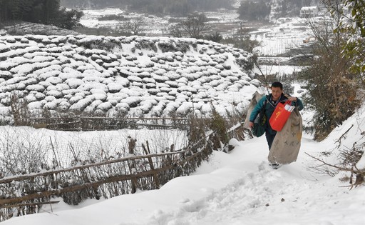连日来,地处大别山区的安徽省六安市金寨县普降暴雪,通村山路被冰雪覆盖,车辆难以通行。金寨县张冲乡邮政所的投递员谷明洲改用肩挑手提邮件,步行数十里山路,及时为群众投送邮件。图为金寨县张冲乡邮政所投递员谷明洲踏着被冰雪覆盖的山路为群众送邮件。