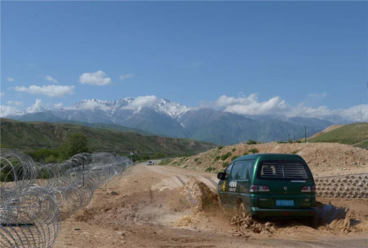 邮车行驶在新疆伊犁霍尔果斯崎岖的盘山路上。