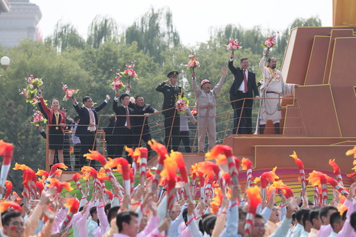 10月1日,在国庆70周年群众游行活动中,其美多吉在“凝心铸魂”方阵主题彩车上接受检阅。《工人日报》记者  王伟伟  摄