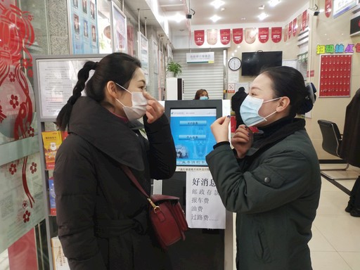 “您好,营业厅已经全面消毒,进入前需要测量一下体温。”