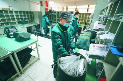 早上7点,侯毅已到岗,按顺序整理好要送的报纸、信件,一个大邮包被塞得满满的。出发前,他先给订户打电话,有人会到门口来取,有人会让他放到门卫处,还有人会让他放到小区统一的暂存点。哪个用户是什么习惯,他都熟稔于心。临走,侯毅戴上塑胶手套、护目镜,全身消毒,兜里随时揣着一瓶消毒凝胶。