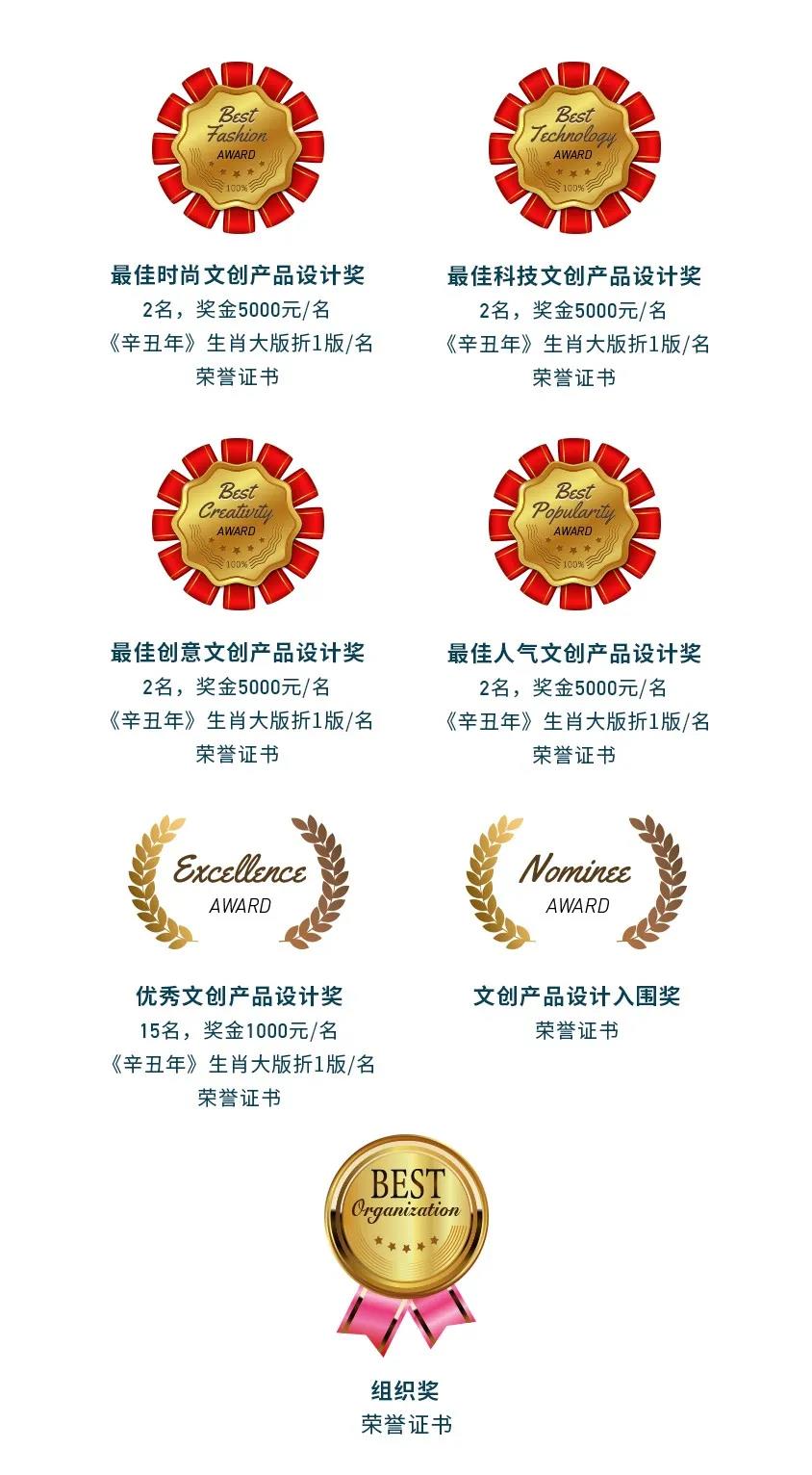 本次赛事还设立了最佳时尚奖、最佳科技奖、最佳创意奖、最佳人气奖和优秀奖等众多奖项,中国邮政将扶植大赛优秀项目,使获奖作品优先转化为具有市场价值的官方文创产品,实现商业化运营,还将选择所有获奖且具备商业化推广潜力的产品,将其列入中邮文创孵化项目。作品作者均将获得邮政文化资源、项目资金、渠道营销等多方面支持。
