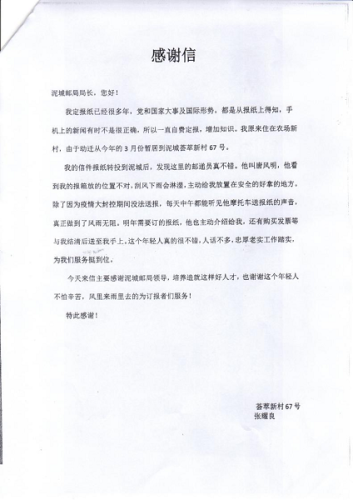 无独有偶,临港营业部的普邮投递员唐凤明,也收到了市民张先生的来信“点赞”。张先生因动迁搬来泥城镇还不满一年,但唐凤明认真负责的工作态度给他留下了深刻印象。张先生说,他原先的报箱位置不对,刮风下雨容易打湿里面的报纸,唐凤明看到后记在心里,四处搜寻,终于找到了一个既淋不到雨又方便取报的地方,在征得用户同意后,顺利实施了移位,这让张先生倍感温暖。