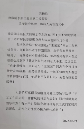 浦东新区大团镇永春北路85弄一位居民来信表示,其家人常年订报,但因身患大病行动不便,而报箱又在弄堂口,出门取报纸十分辛苦,大团营业部的投递员王先明得知这一情况后,急用户之所急,每天傍晚都会将原本投送在弄堂报箱里的报刊直接送到家人手中,并细心叮嘱家人“不要急,慢慢走”,“他的敬业、一丝不苟地为人着想的精神感动了我!他送到不仅是报纸,是老百姓的温暖呀!”来信人的感激之情溢于言表。