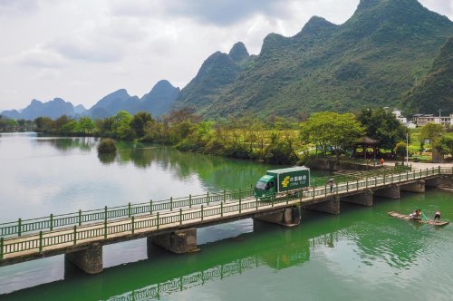 邮车行驶在桂林市阳朔县遇龙河的大桥上。□周华 摄