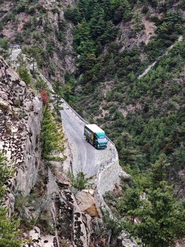 德玛龙村地处原始森林,植被茂密,景色宜人,看似优美的道路,实则崎岖难行,烟雨迷蒙,连绵的细雨,看不到停的迹象,雨雾严重阻碍着视线;湿滑的地面也让邮车举步维艰。山脉蜿蜒起伏,道路百折千回。看着稳如泰山的罗布多吉,置身车内,深感天旋地转的记者不禁发问:“您不会晕车吗?”