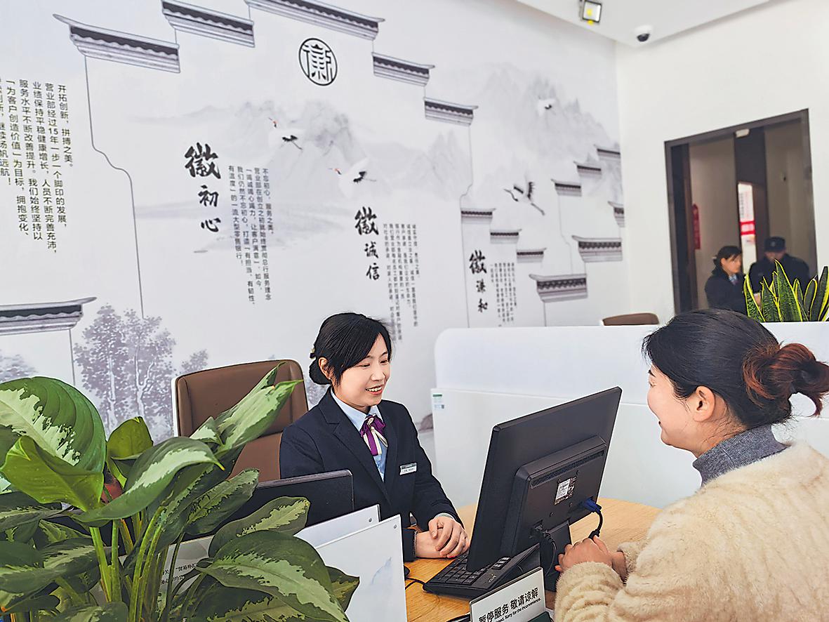 走进网点,满目皆景。砖石土木搭建起金融服务的框架,徽派元素的点缀赋予其独特的魅力与韵味。以徽州建筑为设计灵感的文化幕墙,让每一位到访者都身临其境地体会到“一蓑烟雨梦徽州,青砖黛瓦马头墙”的美景。“营业部成立于2008年。2023年,我们结合‘徽文化’特色对网点进行了全面装修改造。”黄山市分行营业部负责人朱震星介绍,在“徽文化”的熏陶下,黄山市分行营业部充分融入了徽派建筑的风格、徽商文化的精神。