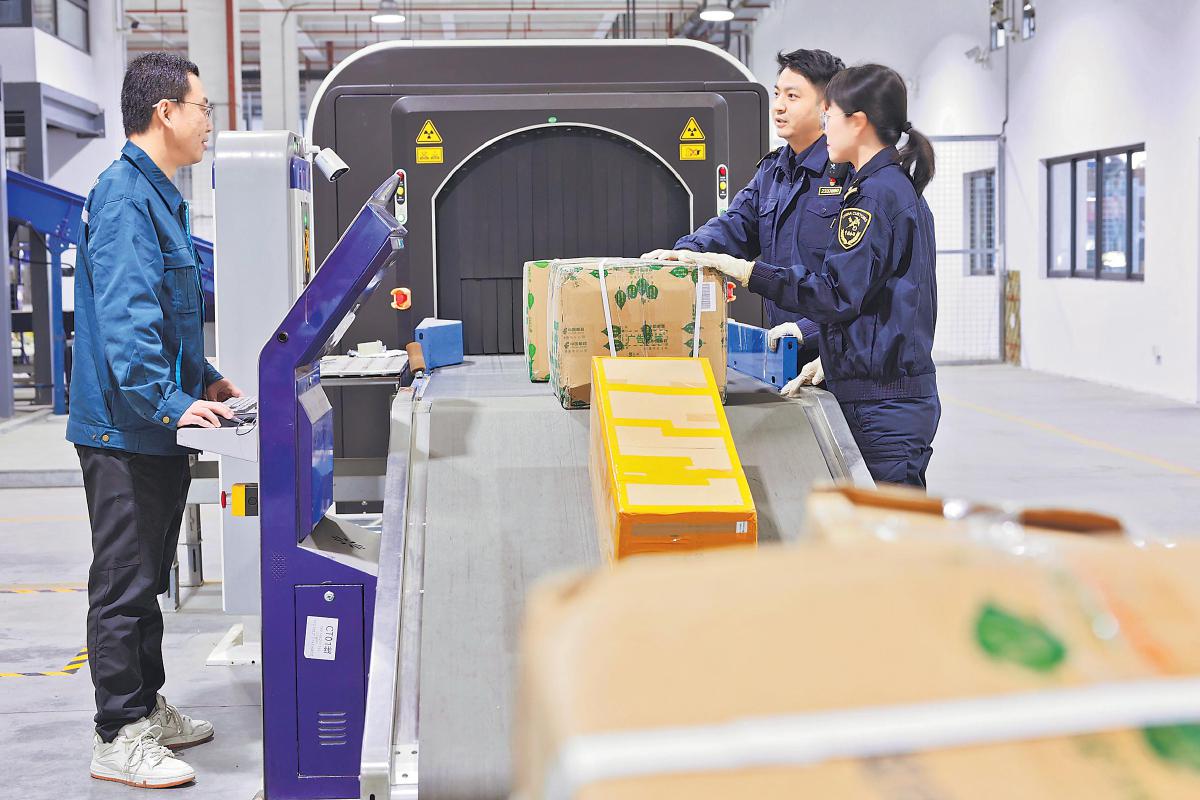 苏州邮政配备与海关联网的同屏比对系统,通过网业联动,做好承运商运能的分配和管控,持续提升苏州及其网络辐射区域出口邮件的通关效率,帮助跨境电商企业提升海外市场竞争力。同时,海关与邮政通过物理隔离、分区作业等措施加强对邮件的监管,确保邮件安全。图为邮政与海关人员在苏州国际邮件互换局对国际邮件进行过机安检。