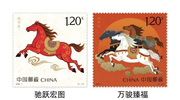 2026年是农历马年,《丙午年》特种邮票图案名称分别为“驰跃宏图”“万骏臻福”,将马的形象与吉祥寓意巧妙结合。